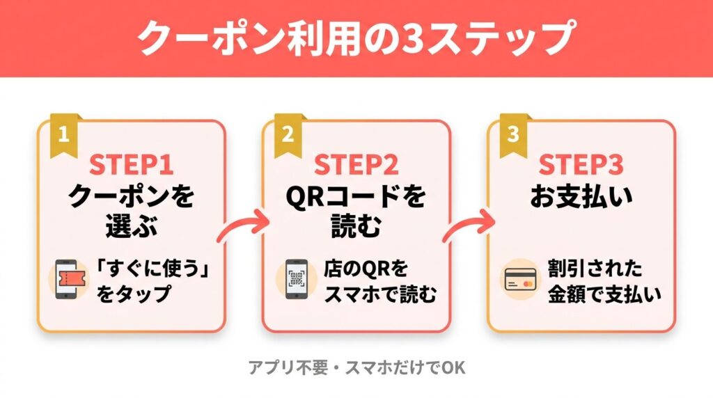 トクトククーポンの利用はとてもシンプルで、スマートフォン1台あれば3ステップで完了します。専用アプリのインストールも不要です。