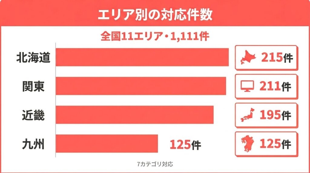 • 対応施設に偏りがある: エリアによっては対応施設が少ない場合があります(四国は14件、甲信越は29件など)