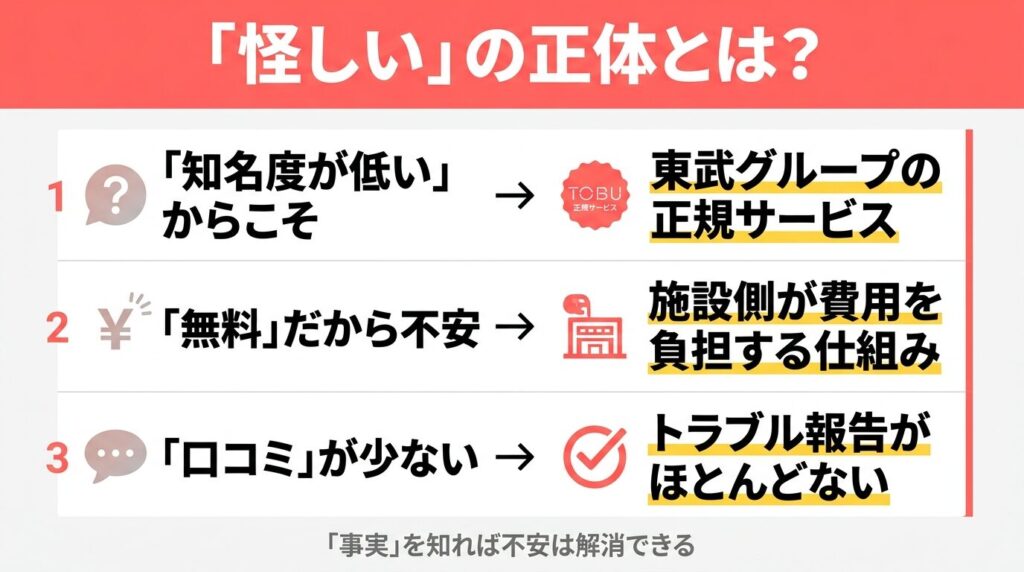 トクトククーポンは「怪しい」のではなく「知られていない」だけ。東武グループの正規サービスを無料で活用しましょう