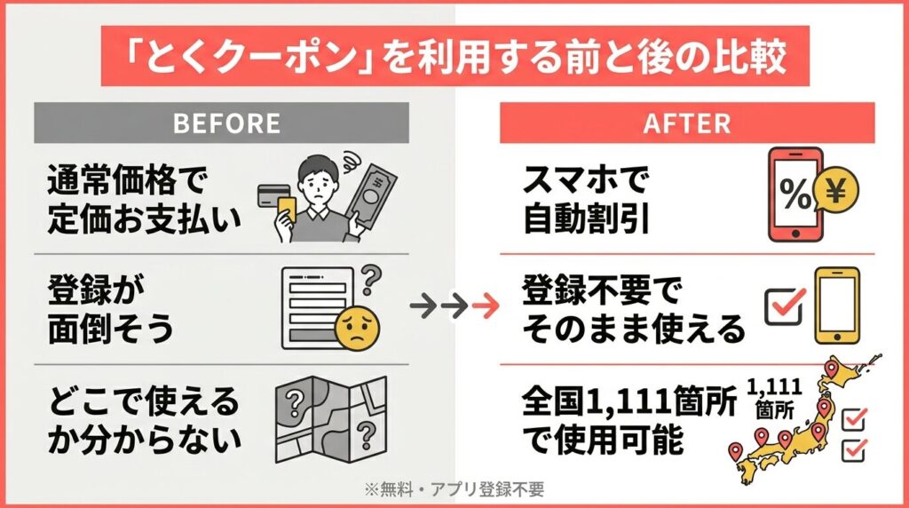 トクトククーポンは「大幅割引」を期待するサービスというよりも、「無料で使えるなら使っておいて損はない」という位置づけで考えるのがおすすめです。