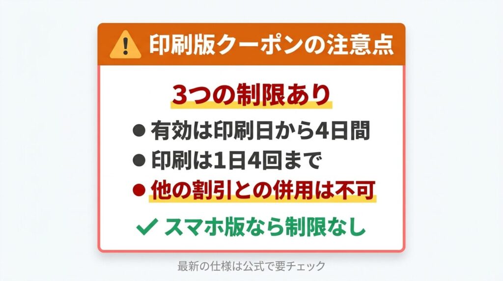 他の割引との併用ができない点は、スマートフォン版・印刷版どちらにも共通するルールです